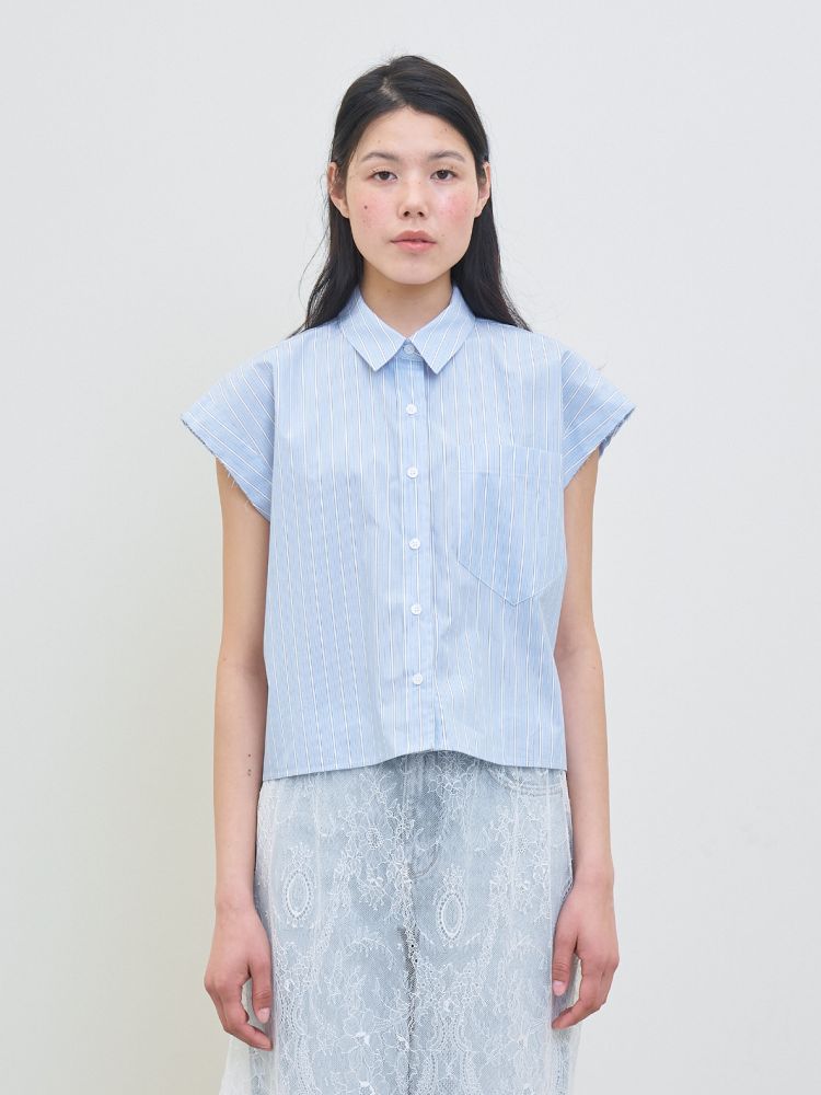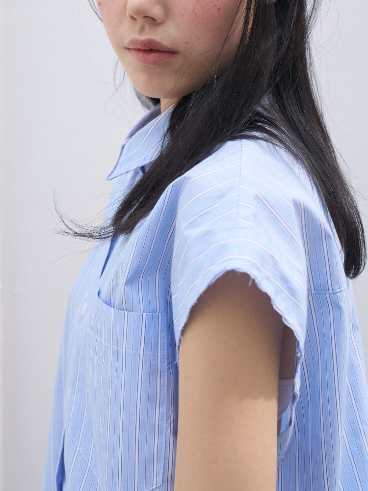 청량한 블루 컬러의 스트라이프와 짧은 기장과 세련된 소매단 디테일로 경쾌한 느낌