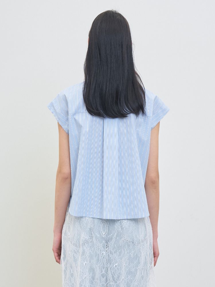 스트라이프 패턴 코튼 원단의 슬리브리스 블라우스