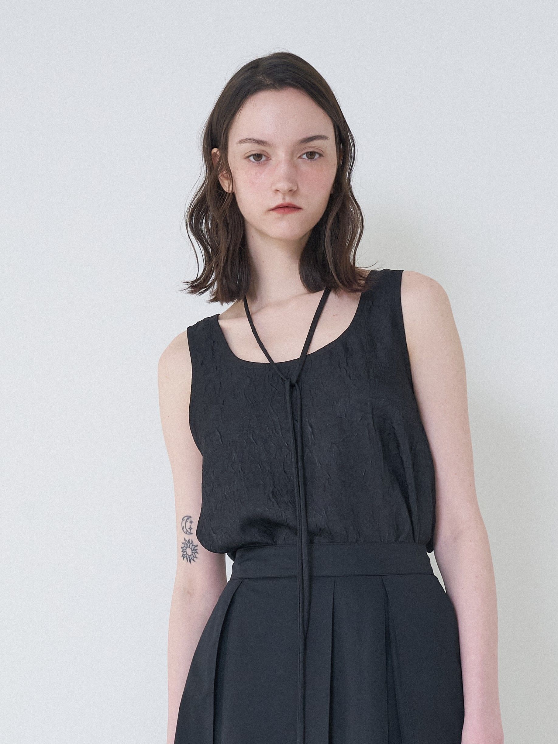 자연스러운 텍스처가 돋보이는 슬리브리스 탑. 은은한 광택이 고급스러움을 더하며, 넥 라인의 롱 스트랩으로 다양하게 연출할 수 있어 스타일링에 유연함을 줍니다.단독 또는 이너로 활용하기 좋은 시즌리스 아이템입니다.