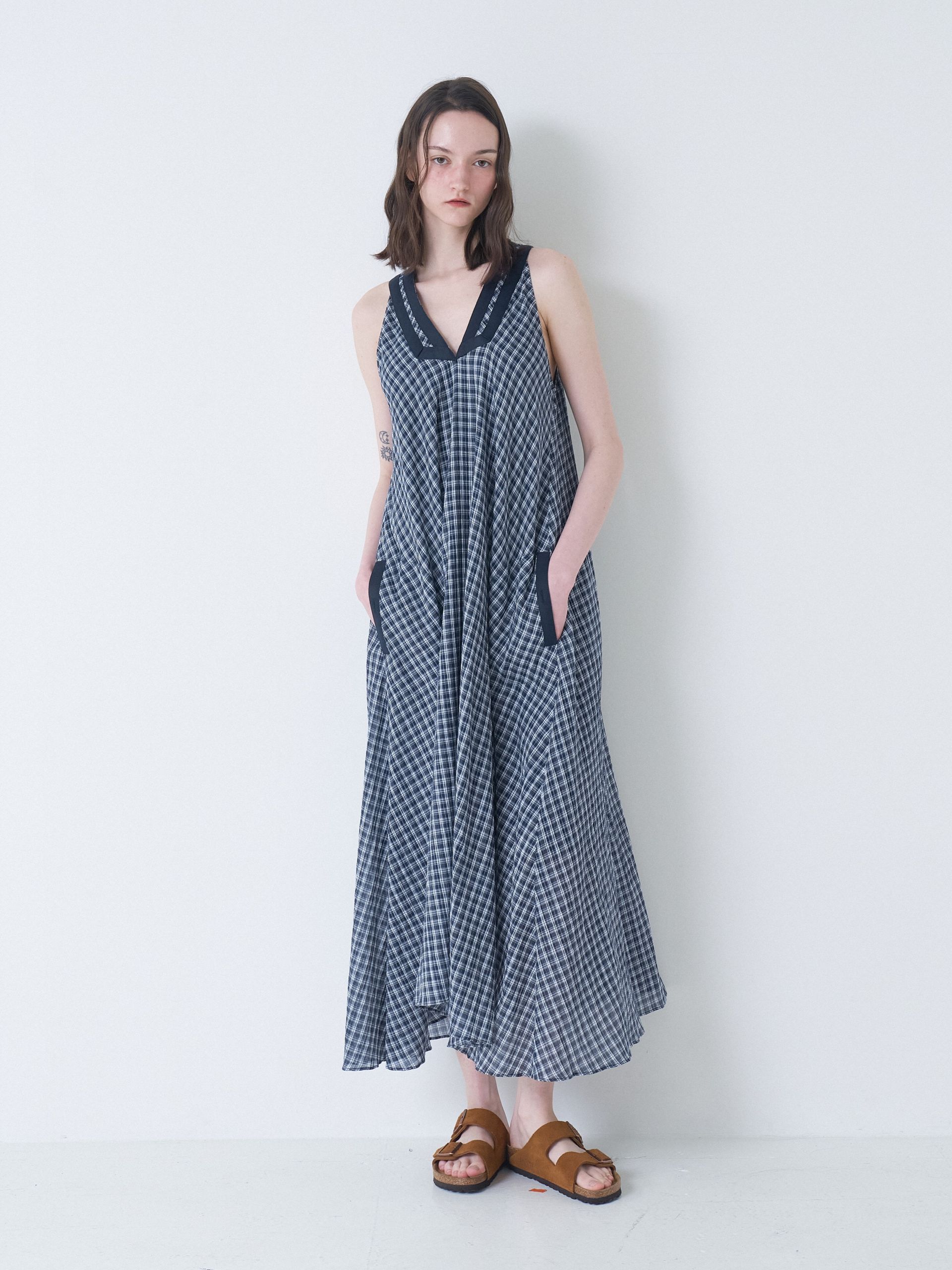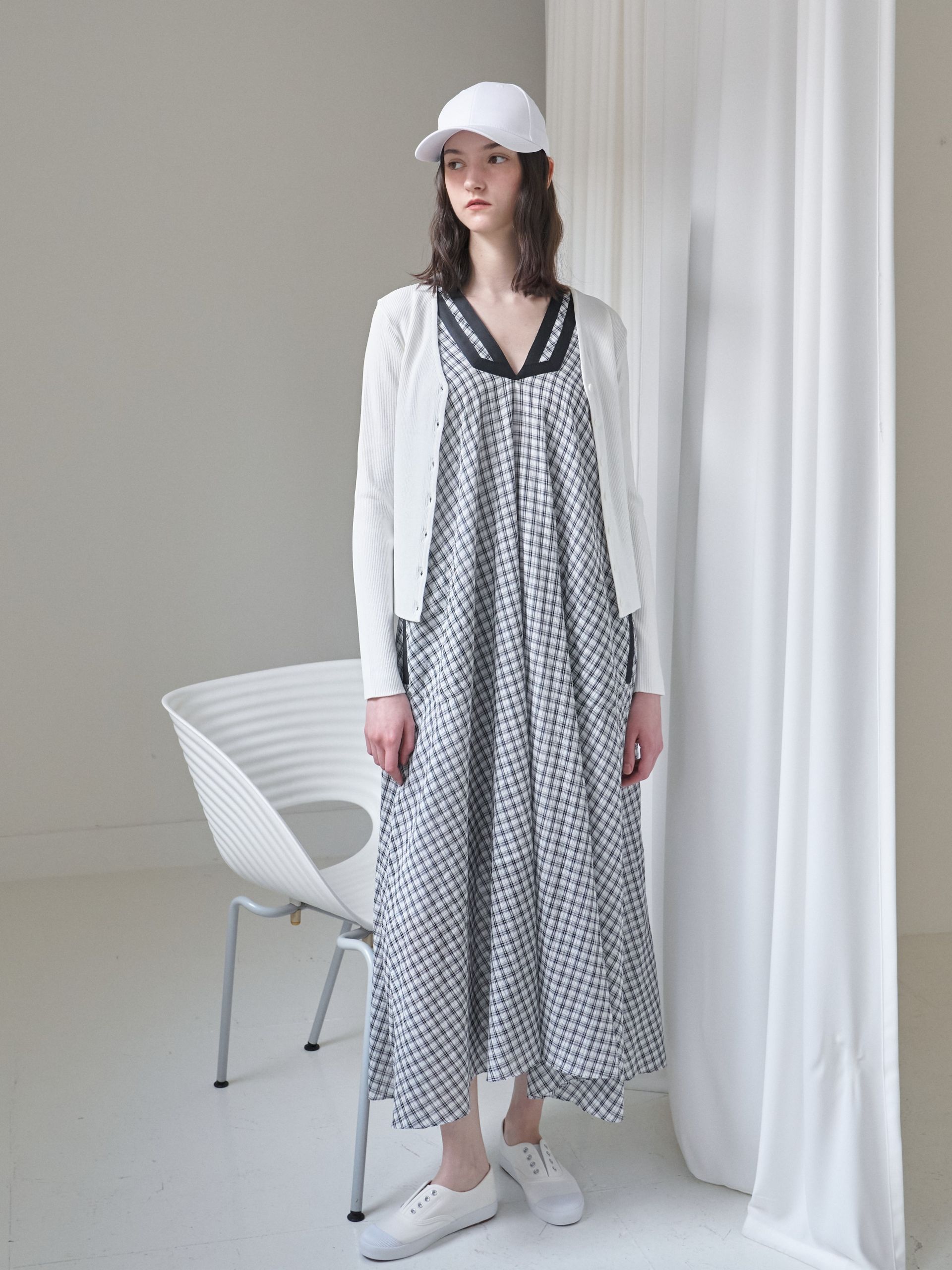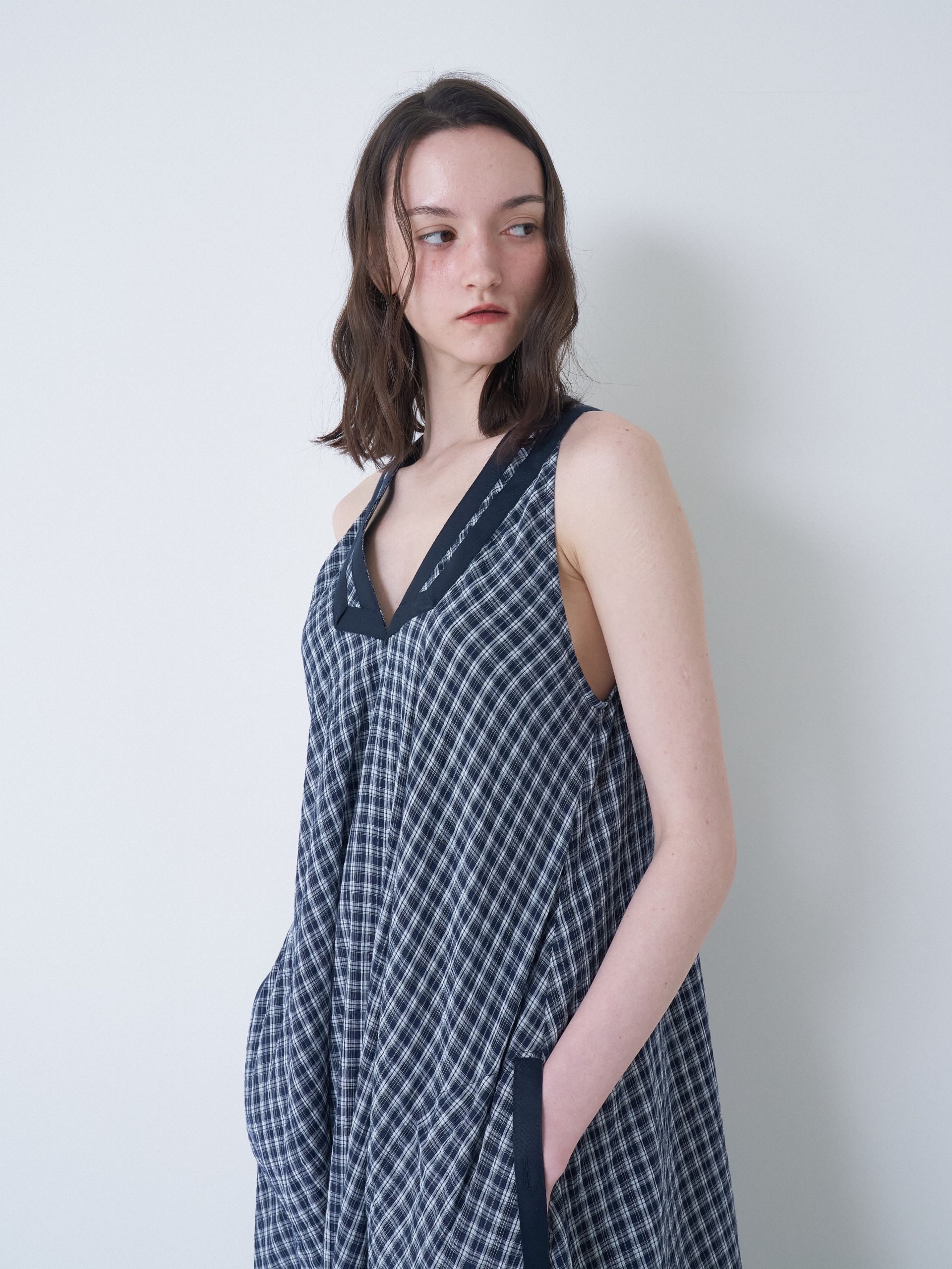 가볍고 시원한 터치감의 체크 원단으로 제작된 슬리브리스 드레스. 깊게 파인 V넥 라인과 대비되는 테이핑 디테일이 포인트가 되어 단정하면서도 세련된 실루엣을 연출합니다.  흘러내리는 듯한 여유로운 핏으로 편안한 착용감을 제공합니다.