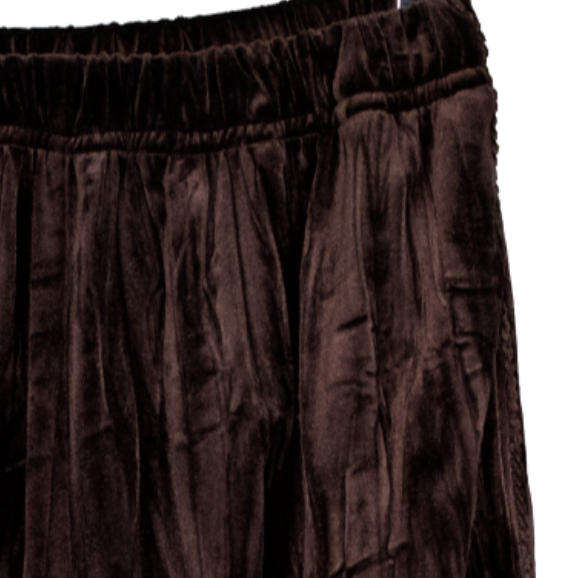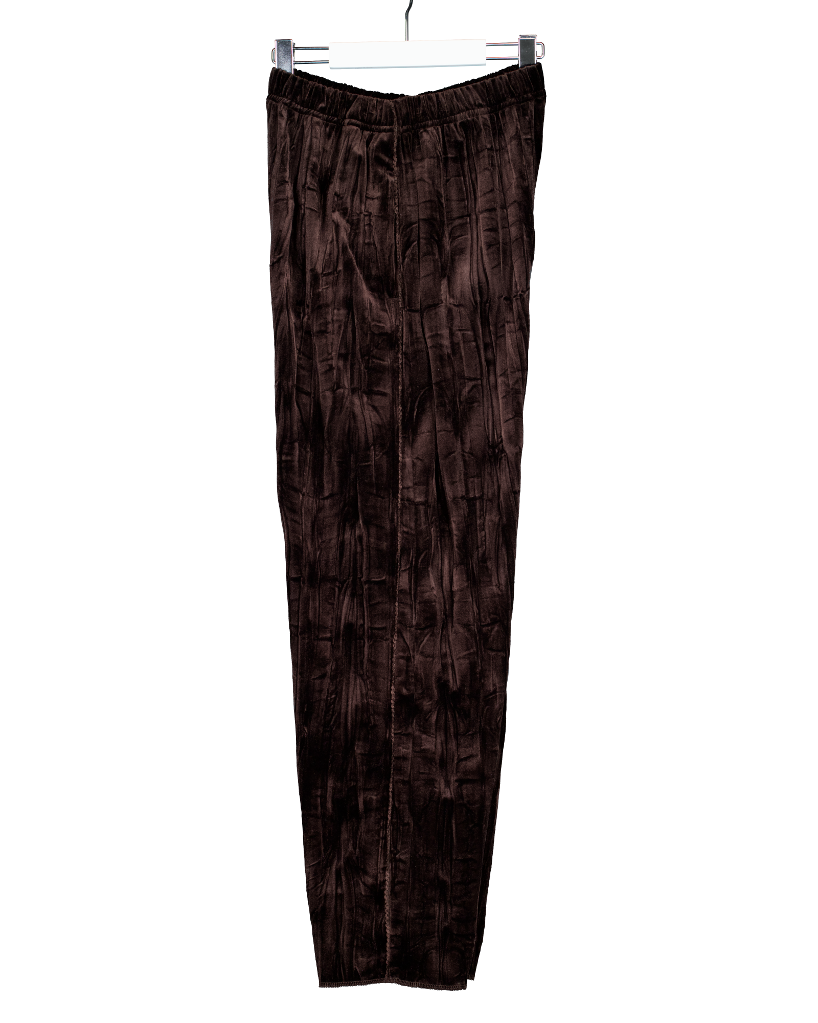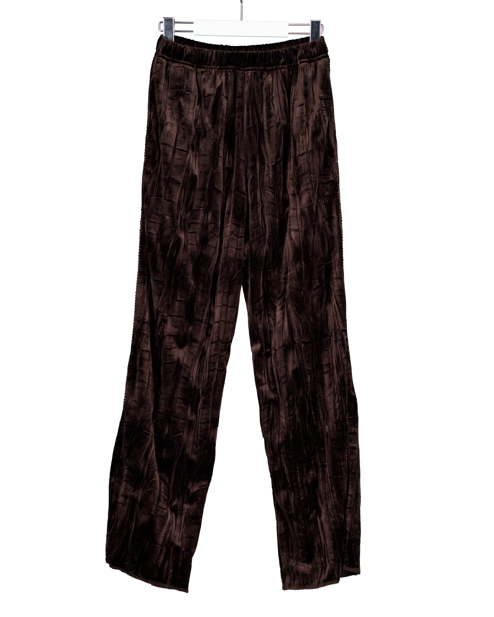 - 자연스럽게 잡힌 크링클 텍스처가 돋보이는 벨벳 팬츠입니다. 빛의 각도에 따라 은은하게 변화하는 광택이 독특한 분위기를 주며, 실루엣에 입체감을 더해줍니다.