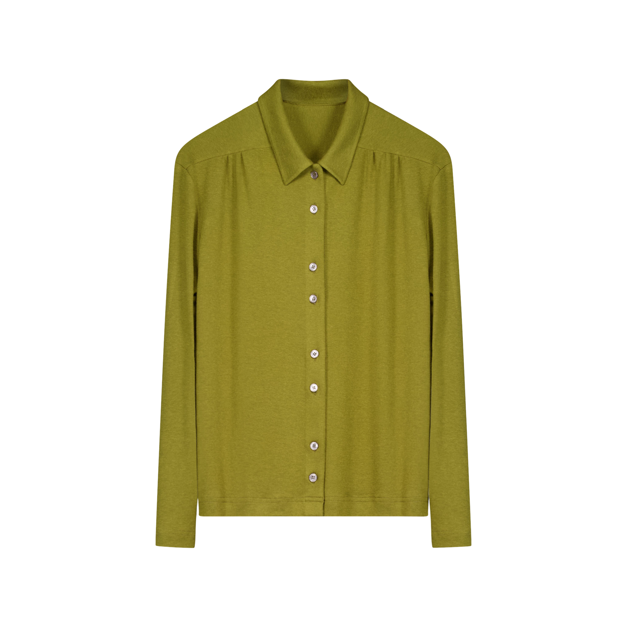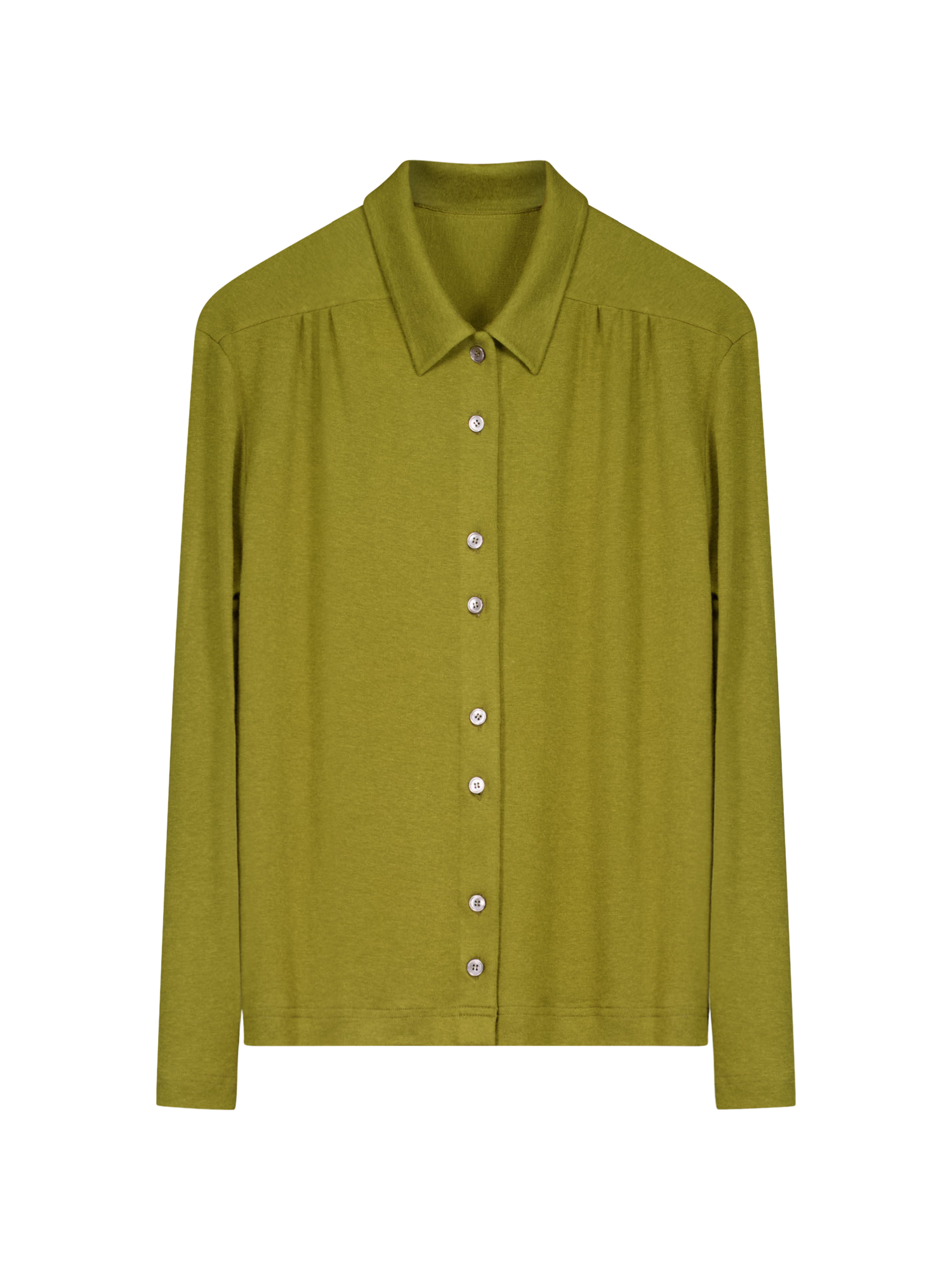 - 가볍고 유연한 소재로 제작된 버튼다운 스타일의 롱슬리브 탑, 셔츠의 단정함과 카디건의 편안함을 동시에 갖춘 디자인으로, 전면의 단추 디테일이 깔끔한 무드를 더해줍니다.